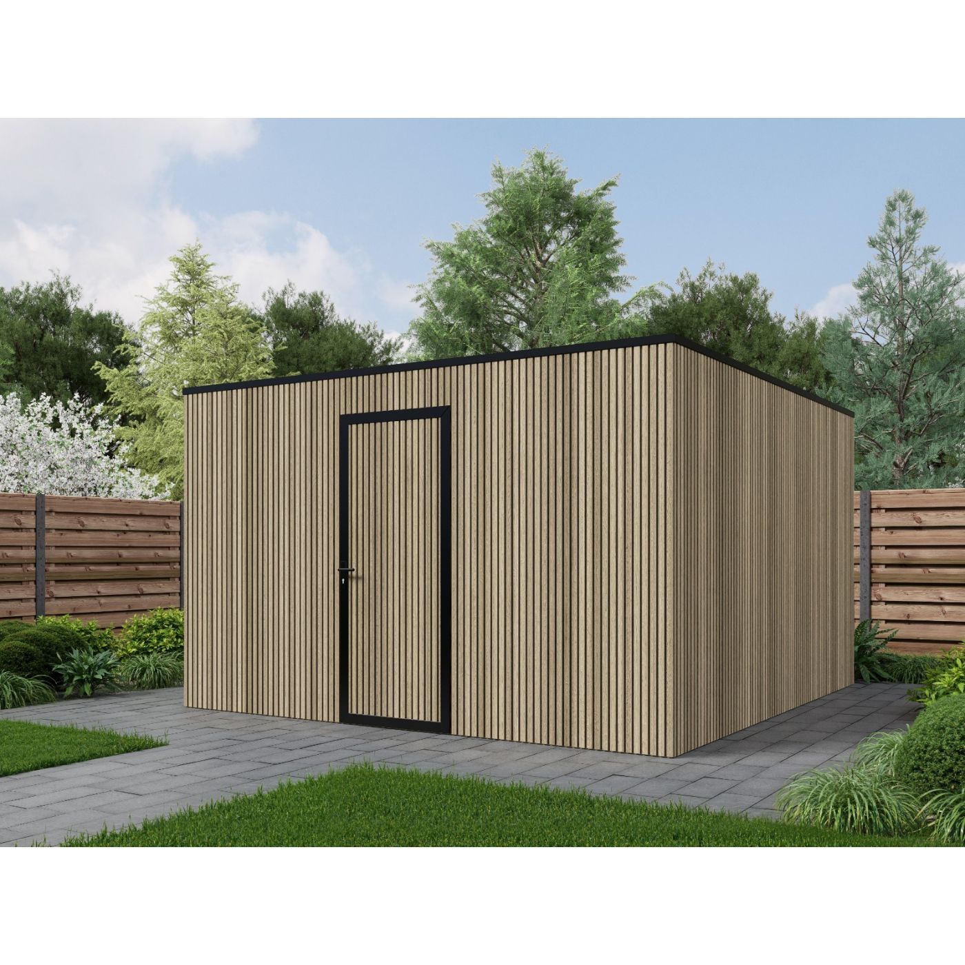 Deze Composiet schuur heeft een buitenwerkse maat van 400cm breed en 400cm diep.