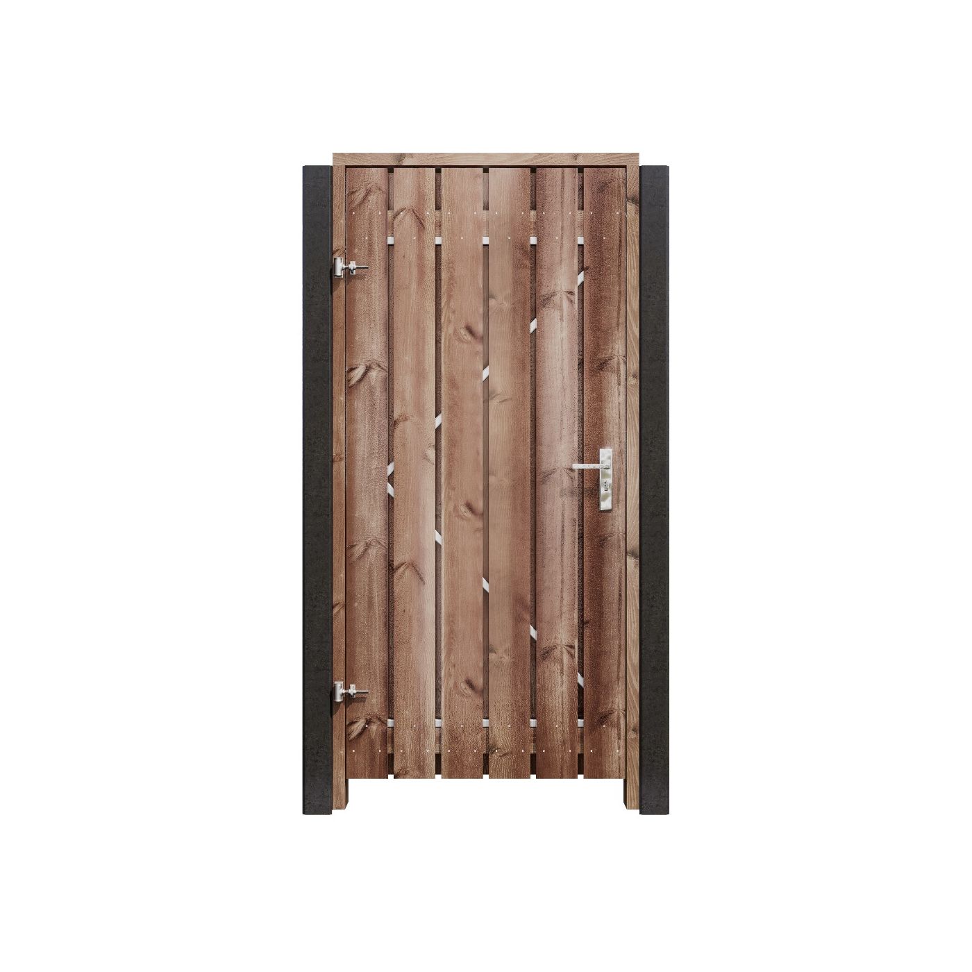 De tuinpoort wordt compleet geleverd met een bijpassend houten kozijn, een slotset met krukken en al het benodigde bevestigingsmateriaal, zodat u direct kunt starten met de montage.