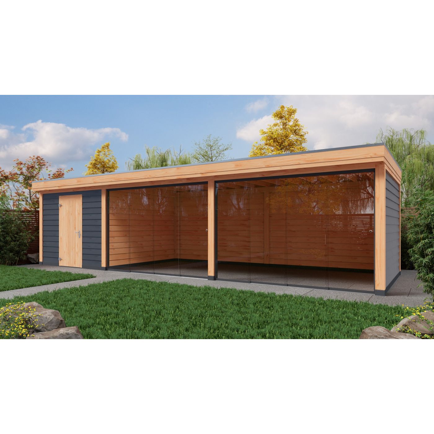 Deze overkapping heeft een buitenwerkse maat van 1000cm breed en 300cm diep inclusief overstek van 20cm. Het zitgedeelte heeft een afmeting van 700cm breed en 300cm diep en het schuurgedeelte is 300cm breed en 300cm diep met een douglas deur aan voorzijde.