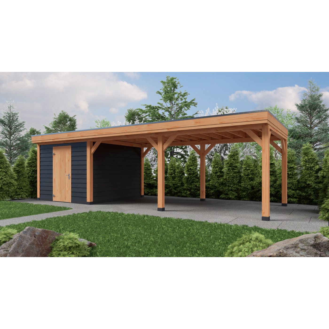 Als dakbeschot gebruiken wij douglas dak planken gladgeschaafd en wordt waterdicht afgewerkt met ons hoogwaardig Boscover EPDM en aluminium daktrim set.