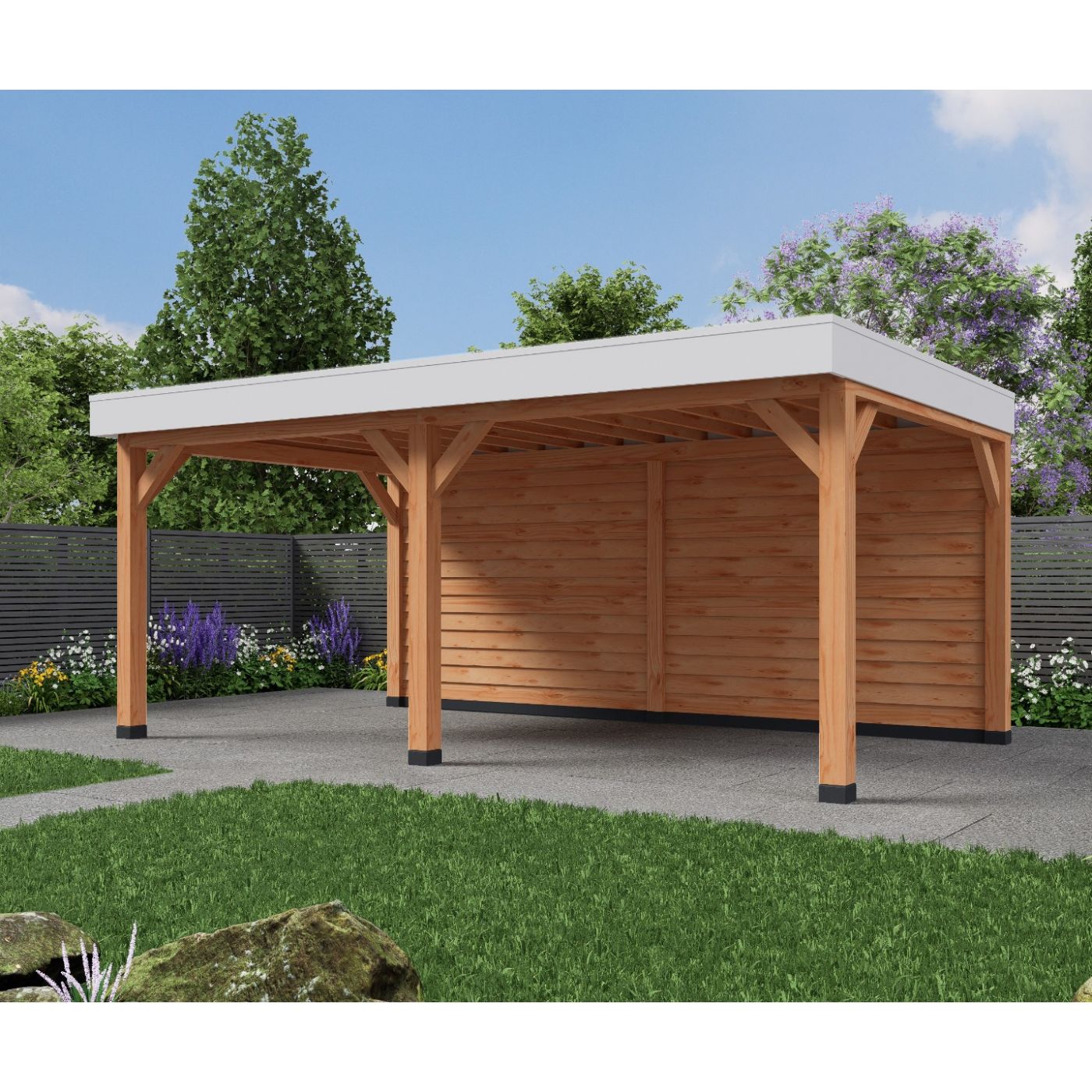 Als dakbeschot gebruiken wij douglas dak planken gladgeschaafd en wordt waterdicht afgewerkt met ons hoogwaardig Boscover EPDM en aluminium daktrim set.