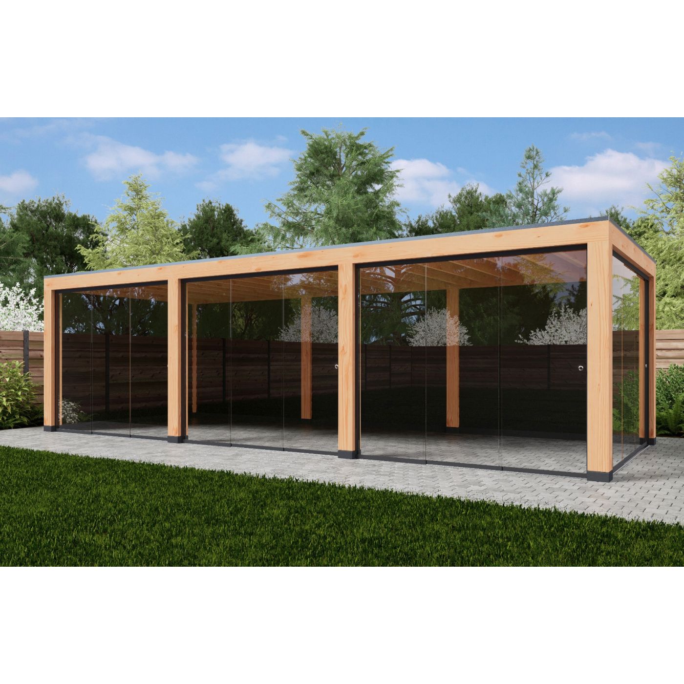 Deze overkapping heeft een strak geheel zonder overstek wat zorgt voor een robuuste uitstraling.