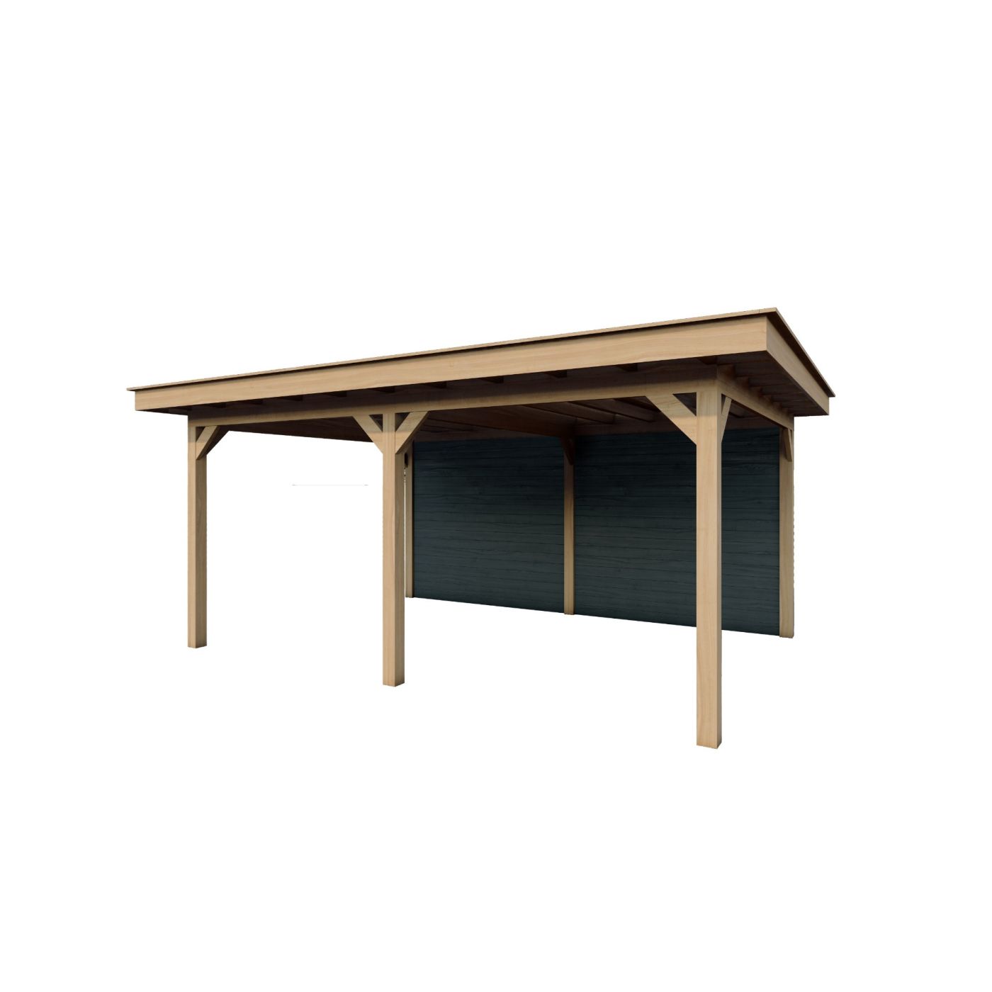 Deze overkapping heeft een buitenwerkse maat van 560cm breed en 380cm diep inclusief overstek van 30cm.