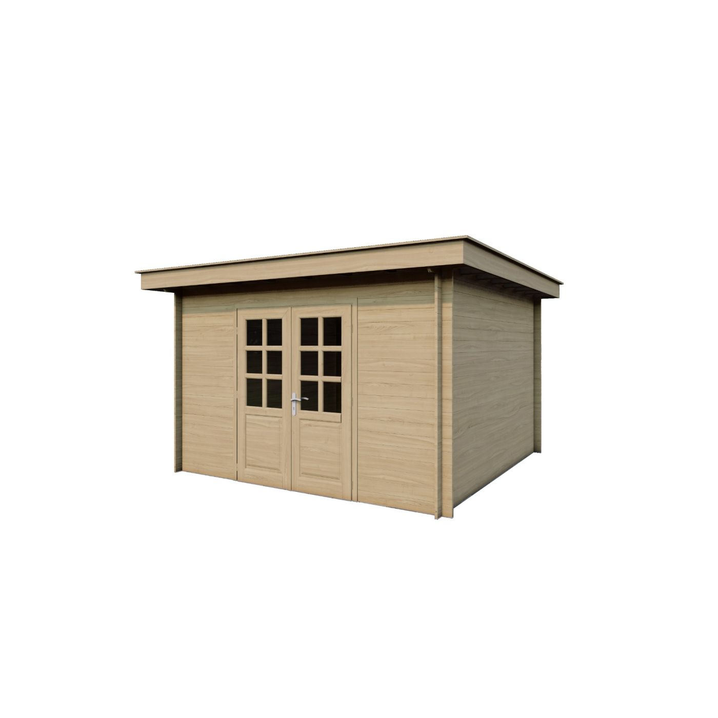 Deze schuur heeft een buitenwerkse maat van 410cm breed en 390cm diep inclusief overstek van 30cm.